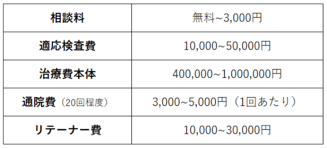 費用内訳 | 相談料 | 適応検査費 | 治療費本体 | リテーナー費 (両顎) |